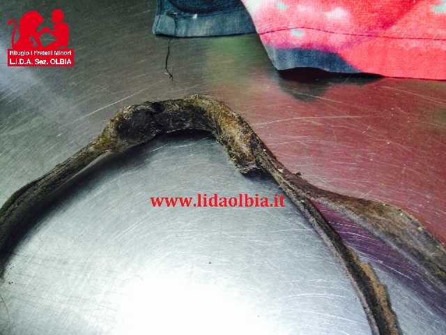 E' stato immediatamente sottoposto a sedazione e i nostri veterinari hanno faticato non poco a togliergli quello che ormai per lui era diventato uno strumento di tortura, pieno di pus anche nella testa.